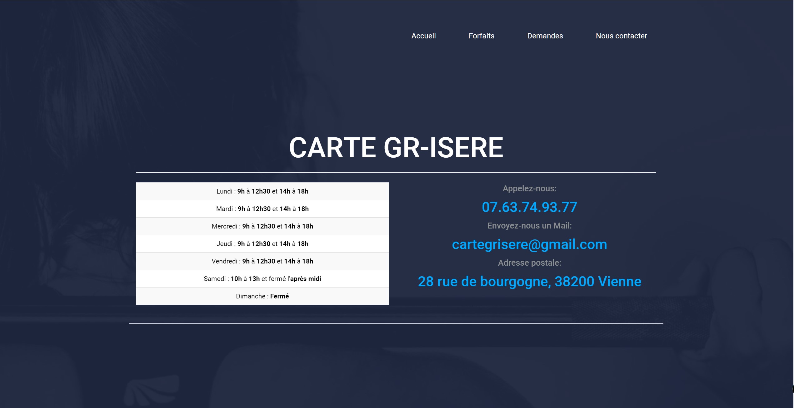 Crée en Décembre 2017, CARTE GRR-ISERE est un centre agrée par la préfecture l'autorisant à s'occuper des papiers des véhicules tel que des cessions ou des changement de plaques d'immatriculations. C'est un site web présentant les forfaits et les demandes que prend en charge cette entreprise ainsi qu'un formulaire permettant d'envoyer son dossier par mail afin d'éviter les déplacements.