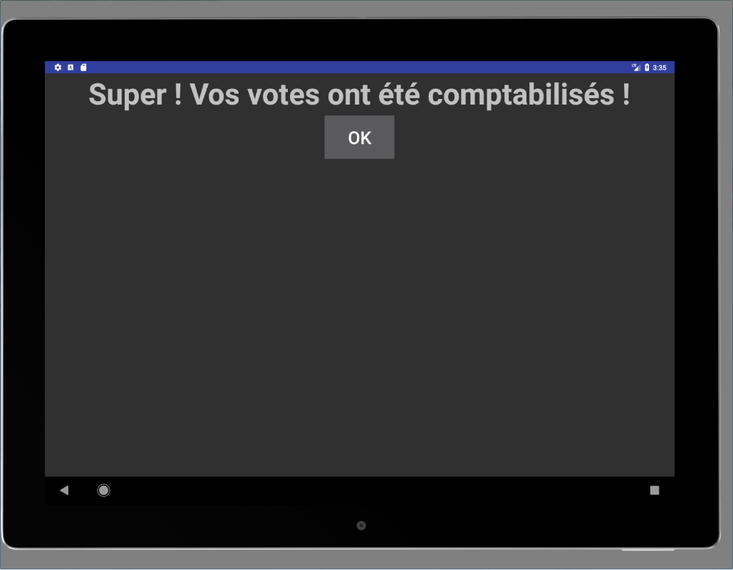 Le client à administré tout ses votes. En appuyant sur "OK" il sera redirigé sur la pages du ticket de caisse